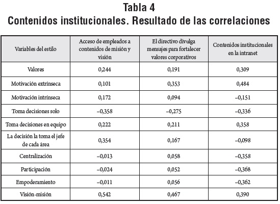 En este mismo segmento se han presentado correlaciones significativas entre la divulgación de contenidos operativos en la intranet y los tres modelos de toma de decisiones que se han encontrado en la muestra: centralización (0,808), participación (0,808) y empoderamiento (0,808). Este resultado relaciona la orientación a las relaciones y el liderazgo con los contenidos operativos. Sin embargo, estaría indicando que sin importar el estilo del directivo, los medios electrónicos se utilizan para divulgar información relativa a la tarea. Otro dato que se precisa comentar es la ausencia de relación (0) que se presenta entre los valores y la difusión de contenidos operativos en la intranet, y entre la toma de decisiones descentralizada y la misma variable de comunicación. Los resultados indican que no existe un vínculo entre las variables.