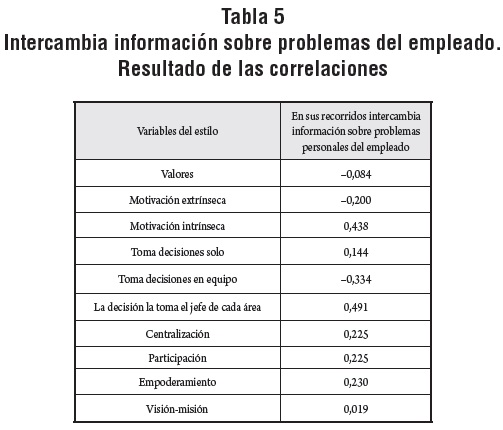 También se halló una relación positiva entre el grado en que se intercambian contenidos relativos a problemas personales del trabajador con los casos en que las decisiones las toman los jefes de las áreas (0,491). En las tablas 3, 4 y 5 se presentan los resultados de estas correlaciones.