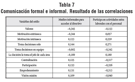 No se encontraron relaciones significativas entre la utilización de medios informales para acceder al directivo con las variables del estilo. Tampoco se ha detectado que la participación del directivo en actividades extra laborales con el personal esté relacionada positivamente con el estilo orientado a las relaciones y el liderazgo y negativamente con los estilos laissez-faire y orientado a la tarea. Los resultados de las correlaciones sobre comunicación informal aparecen en la tabla 7.
