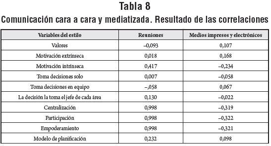 En el apartado teórico se ha considerado que la preferencia por el uso de medios de comunicación, impresos y electrónicos, está relacionada positivamente con los estilos laissez-faire y orientado a la tarea y asociada negativamente al estilo orientado a las relaciones y al liderazgo. El teléfono no ha sido correlacionado con las variables del estilo porque no fue señalado como medio más utilizado por parte de ningún directivo. Las correlaciones efectuadas en este segmento no indican relaciones significativas. Los resultados de las correlaciones concernientes a la preferencia por determinados medios de comunicación se presentan en la tabla 8.