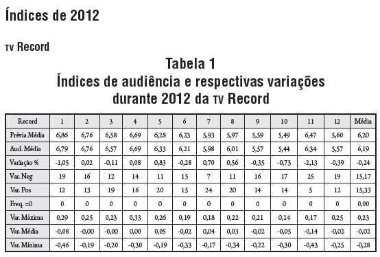 Verifica-se que em 2012 a TV Record teve uma média da audiência prévia de 6,20 pontos e consolidada de 6,19 pontos. Isso representa uma oscilação negativa de 0,01 ponto, ou na média do ano, os programas tiveram uma audiência 0,24% menor de do que a apontada pela prévia.