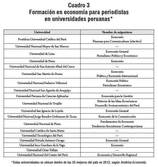 Para ahondar sobre este punto, se ha analizado la oferta de las universidades peruanas en la formación del periodista económico. Se han tenido en cuenta los planes de estudio de 19 facultades o escuelas de comunicación en el Perú entre las 35 mejores universidades del país de 2012, según el ranking de la revista América Economía21. Esta muestra supone el 50% del total de los centros que forman periodistas.22
