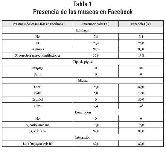En cuanto a la "presencia" de los museos en Facebook, no hay diferencias sustanciales entre los museos españoles e internacionales. Es de destacar que la gran mayoría de las instituciones (más del 90%) tienen presencia en esta red social (siempre con la fórmula de la fanpage), donde incorporan una correcta descripción de la institución y vinculan mayoritariamente la página de Facebook con el website de la entidad. Si consideramos actualmente que Facebook es "la" red social por excelencia (ya señalado en la instrucción de este artículo) y relevancia (Claes & Detlell, 2014; Distaso & McCorkindale, 2013), los museos están aprovechando las facilidades que ofrece la creación y mantenimiento de una página de Facebook (muy accesible económica y técnicamente), para disponer de una presencia permanente en esta red social de referencia.