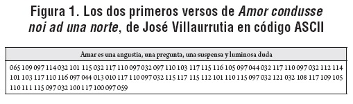 El archivo no contenía ningún tipo de metadatos, pero tampoco características tipográficas, como subrayados, negritas, páginas, encabezados o subtítulos; algunas de esas variantes, como los títulos, se representaban utilizando mayúsculas. Vistos a la distancia, los primeros textos digitales presentaban un texto apenas suficiente para ser comprensible para un lector. En ellos podemos observar, por primera vez, la diferencia entre los datos almacenados en la computadora y el texto que aparecía en la pantalla. La diferencia estaba dada por la codificación ASCII que traducía los datos elementales del texto, como las letras, los espacios entre palabras, la puntuación, a un código numérico, para que, desde ahí, la computadora lo interpretara para su posterior representación en el espacio de una pantalla (figura 1). Para Hillesund (2005) este es el cambio más significativo de la digitalización respecto del proceso de producción textual en lo impreso: