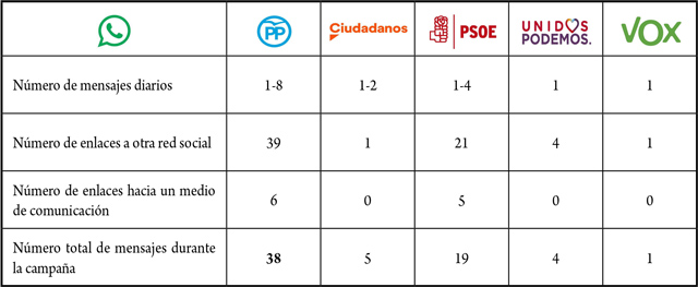 Así, los denominados partidos tradicionales, como el PP, que llegó a emitir hasta 38 mensajes durante el tiempo analizado, o el PSOE, que alcanzaba los 19 mensajes, fueron considerablemente más activos en su canal de WhatsApp en comparación con los partidos nuevos, tales como C’s, con cinco mensajes; UP, con cuatro, y en menor medida, Vox, con tan solo un mensaje. En lo que se refiere a número de mensajes diarios emitidos, también fueron los dos partidos tradicionales, PP y PSOE, los que más hicieron uso de la red de mensajería instantánea por excelencia, que alcanzaron cifras de hasta ocho mensajes diarios en el primer caso y cinco en el segundo. El resto de los partidos se conformaron con un solo mensaje emitido al día.