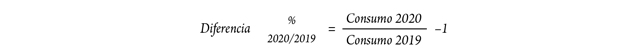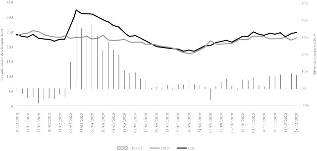* Para 2019, línea gris; para 2020, línea negra; en barras: diferencia porcentual de consumo entre semanas equivalentes de ambos años. Fuente: elaboración propia.