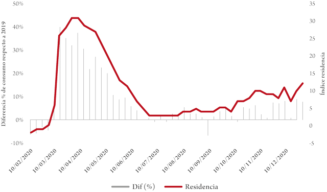 Octubre: estado de alarma en la Comunidad de Madrid y segundo estado de alarma nacional. En octubre, coincidiendo con un empeoramiento de la situación epidemiológica, la movilidad a lugares de trabajo se reduce ligeramente, siendo la afluencia a comercios y espacios de ocio la que más se resiente en términos de movilidad. Con todo esto, el tiempo que se pasa en el domicilio aumenta paulatinamente, mientras que la movilidad a supermercados y farmacias se estabiliza en niveles muy cercanos a los previos al decreto del estado de alarma. El índice relacionado con comercio y espacios de ocio pasa de -23% a -35% (-12 p.p.), el vinculado al tránsito en estaciones de transporte -22% a -29, el de lugares de trabajo de -18% a -25% (-7 p.p.) y el de supermercados y farmacia de 0% a -4% (-4 p.p.). El tiempo destinado a estar en la residencia aumenta y su índice pasa de 4% a 9% (+5 p.p.). El consumo de TV es un 5% superior al del año pasado.