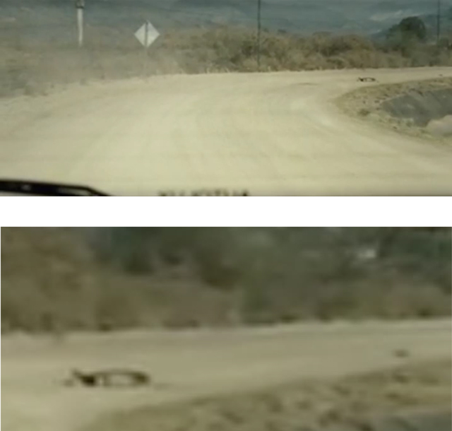 Los encuadres son exactamente iguales, con la salvedad de que Verónica ha decido quitarse las gafas de sol. Este hecho es relevante, pues parecería que la escena ha sido rodada en continuidad y que, a posteriori, ha sido montada con los otros dos planos frontales (delanteros y traseros) de la carretera (planos 1 y 3). Sin embargo, se destaca el siguiente detalle: las huellas en ambos encuadres son diferentes. Diferencia palmaria desde el momento en que ambas están enmarcadas por un mismo encuadre con poca profundidad de campo.