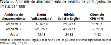 Según Roberts (1972), la conservación de semillas durante el almacenamiento depende del grado de humedad y de los factores ambientales de almacenamiento como temperatura y oxígeno del aire. Así, para los tres portainjertos, el ambiente de almacenamiento influyo considerablemente en la viabilidad. Los porcentajes de germinación fueron más bajos en semillas almacenadas en el ambiente 2 (Tabla 5). Al respecto, Usbertí y Felippe (1980) observaron que las semillas de C. limonia pueden almacenarse a 4°C por 32 meses sin perder viabilidad cuando contienen 6% de humedad; de igual forma King et al. (1981), señalaron que las semillas de C. limon y C. aurantifolia son ortodoxas, porque su viabilidad se conservó con la disminución en la temperatura de almacenamiento y contenido de humedad en la semilla.