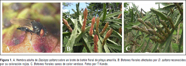 Entre los problemas fitosanitarios de importancia económica en el cultivo de pitaya amarilla se destaca la mosca del botón floral, D. saltans (Figura 1A) ocasionando pérdidas en la floración que varían entre 40% y 80% (López y Ramírez, 1998; Vergara y Pérez, 1988). En un estudio realizado en una finca de pitaya amarilla en el municipio de Fusagasugá (Cundinamarca), los lotes con mayor floración presentaron el mayor porcentaje de pérdidas de botón floral (Vergara y Pérez, 1988). En el Valle del Cauca, la mosca del botón floral se conoce como una plaga limitante ocasionando daños hasta del 80% en los municipios de Bolívar, Restrepo y Trujillo (J. Medina, comunicación personal, 2012).