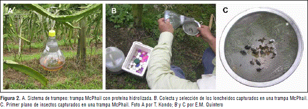 Las trampas McPhail se ubicaron a una altura del suelo de 1,0 a 1,5 m (Figura 2A), donde se encuentra el mayor número de botones florales, separadas a una distancia de 10 m entre sí y dejando tres surcos de por medio entre cada repetición. Los cebos se prepararon un día antes de ser llevados a campo, a una concentración del 5% de proteína hidrolizada más 20 g L-1 de Bórax, y se conservaron en una nevera a temperatura de 5°C para prevenir su descomposición. Se utilizaron 200 cm3 de proteína hidrolizada por trampa (Figura 2A). La lectura de cada trampa se hizo cada 8 d seleccionando y contabilizando en campo los adultos de Lonchaeidae atrapados (Figura 2B y C).