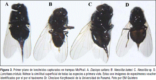 En las trampas McPhail se colectaron cuatro morfoespecies de Lonchaeidae, las cuales fueron identificadas por el taxónomo Dr. Cheslavo Korytkowski de la Universidad de Panamá, como la mosca del botón floral de la pitaya Dasiops saltans Townsend (Figura 3A), Lonchaea cristula McAlpine (Figura 3B), Neosilba batesi (Curran) (Figura 3C), y Neosilba sp. (Figura 3D). De estas cuatro especies solo D. saltans se ha reportado causando daño a los botones florales (Delgado et al., 2010a; López y Ramírez, 1998; Vergara y Pérez, 1988). Tal como lo mencionan Korytkowski y Ojeda (1971), sobre los Lonchaeidae es muy poco lo que se conoce de sus aspectos biológicos en el Neotrópico. Por otra parte, Delgado et al. (2010b) reportaron a Neosilba sp. (Figura 3D) como una especie que está íntimamente asociada con la pudrición basal del fruto de la pitaya amarilla. Las cuatro especies presentan una morfología muy similar por lo que su diferenciación es muy difícil y más aún en el campo ya que para ello se necesitaría la ayuda de un equipo óptico de gran aumento y un experto taxónomo o una persona capacitada en la taxonomía de este grupo.