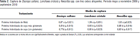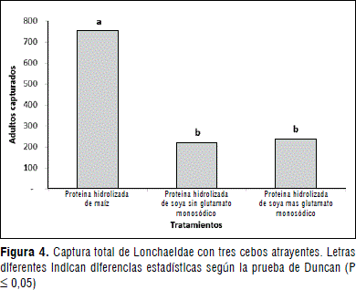 Al realizar la prueba de medias de rango múltiple de Duncan (Tabla 2), se encontró que existen diferencias estadísticas entre el tratamiento con proteína hidrolizada de maíz y los demás tratamientos con proteína hidrolizada de soya y proteína hidrolizada de soya más glutamato monosódico (GL= 2; F= 69,53; P ≤ 0,0001), confirmando que aunque los tres tratamientos capturaron moscas de L. cristula, el mejor y más eficiente para la captura de L. cristulafue el cebo atrayente a base de proteína hidrolizada de maíz, ya que los tratamientos con proteína hidrolizada de soya (sin glutamato monosódico) y proteína hidrolizada de soya más glutamato monosódico son estadísticamente iguales de eficientes para la captura de L. cristula. La proteína de maíz tuvo la mayor captura de Neosilba spp. seguido de la proteína hidrolizada de soya sin glutamato monosódico, y finalmente la proteína hidrolizada de soya más glutamato monosódico.