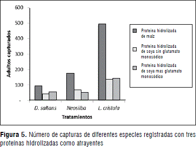 Entre las proteínas hidrolizadas soya sin glutamato monosódico, soya más glutamato monosódico y maíz, fue esta última la que capturó mayores cantidades de moscas en estado adulto. Esta evaluación arroja un resultado que coincide con lo señalado por Tróchez et al. (1985), en el sentido que el mejor cebo atrayente para la captura de moscas adultas del género Dasiops es la proteína hidrolizada de maíz con respecto a los demás tratamientos evaluados.