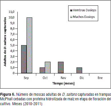 En la Figura 6, se resume las capturas globales de D. saltans, mediante el uso de trampas McPhail cebadas con proteína hidrolizada de maíz.