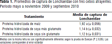 Los tratamientos con proteína hidrolizada de soya sin glutamato monosódico y proteína hidrolizada de soya más glutamato monosódico, donde el número de capturas fue relativamente bajo, resultaron ser iguales estadísticamente. En la Tabla 2, se puede observar el agrupamiento de medias de Duncan y los valores promedio correspondientes al número de individuos capturados por trampa en cada tratamiento.