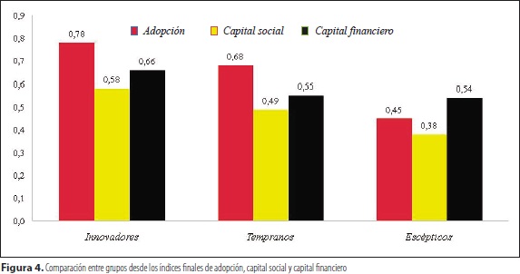 Con base en los resultados de los modelos de regresión expuestos anteriormente, se define una influencia importante y positiva del capital social y el capital financiero sobre la adopción tecnológica, que es para esta investigación directamente proporcional a los buenos niveles de estos dos capitales. Los índices finales se visualizan en la figura 4, donde se ve una comparación de las dimensiones: adopción, capital social y capital financiero, y entre los tres grupos entre sí.