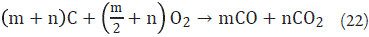 El primer término del denominador de la ecuación 21 indica la difusión de O2 y el segundo término, la reacción química. Los productos de la oxidación del material carbonizado son CO y CO2 como lo describe la reacción global: