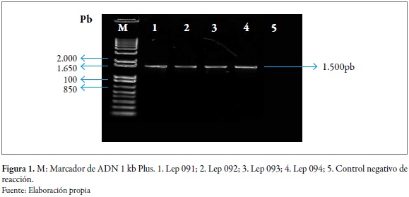 Una vez realizado el seguimiento bacteriológico, se determinaron 69 aislamientos como sospechosos, los cuales fueron sometidos a pruebas de reacción en cadena de la polimerasa (PCR) amplificando el gen 16S del ADNr, para analizar si estas espiroquetas están agrupadas en un ancestro común de protospirocheta, como lo determinan Paster et al. (1991). Se obtuvieron cuatro productos de amplificación de la región del 16S del ADNr (figura 1), que mostraron un fragmento cuyo tamaño fue aproximadamente de 1.500 pb. Así se determinó la presencia de Leptospira spp. en esos aislamientos, lo que confirma la sensibilidad y especificidad de la prueba, de esta manera se concordó con lo obtenido anteriormente por varios investigadores que amplificaron el gen 16S (Grimont y Grimont 1986; Paster et al. 1991; Cerqueira y Picardeau 2009; Torres et al. 2013; Romero-Vivas et al. 2013).