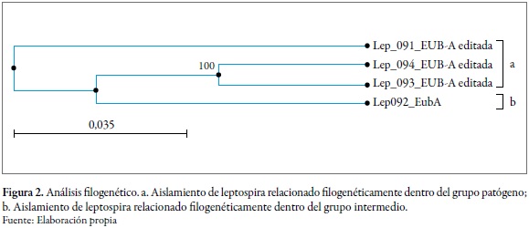 El análisis de secuencia de la región 16S ADNr de los cuatro aislamientos de leptospira permitió su clasificación en dos grupos de patogenicidad (tabla 2). Según los resultados obtenidos del análisis filogenético de este gen, tres aislamientos fueron agrupados dentro de las especies patógenas y uno se relaciona filogenéticamente dentro del grupo de Leptospiras que presentan una patogenicidad de tipo intermedia; es importante destacar que los árboles filogenéticos de estos aislamientos muestran mayor cercanía con las especies patógenas que con las saprófitas (Postic et al. 2000).