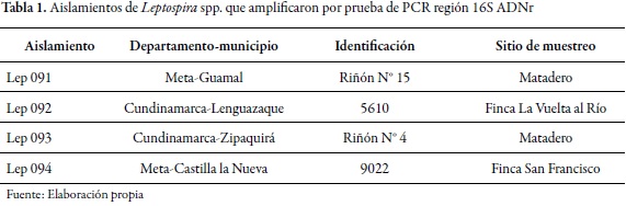 Los asilamientos que amplificaron a leptospira pertenecían los departamentos del Meta y Cundinamarca, según se describe en la tabla 1. Se confirmó que en Colombia, al igual que en otros países como Brasil, India y Nicaragua, existe circulación de cepas de Leptospira spp. en el sistema de producción bovino (Moreno y Agudelo Flórez 2010). Estos aislamientos de leptospira en las dos zonas del país, son determinantes para estudios de respuesta inmunológica, dada la característica de patogenicidad de las especies encontradas.