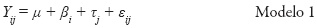 Donde Yij corresponde a la variable respuesta; μ es la media general del experimento; βi son los efectos del bloque/localidad i-ésimo; τj y Gj (modelos 1 y 2, respectivamente) son los efectos j-ésimos correspondientes a los genotipos en estudio; (Gβ)ijson los efectos del j-ésimo genotipo en la i-ésima localidad; y εij (modelo 1) y εijk (modelo 2) son los efectos residuales del modelo (error experimental).