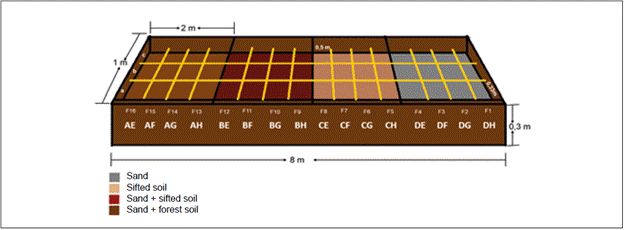 A temporary nursery of 16 x 16m was built in which two germination beds were adapted according to each luminosity condition, with the following dimensions: 1m wide x 8 m long x 0.30 m of depth.