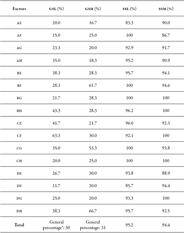 Under SL and SM light conditions, survival was 95 % and 94 %, respectively (table 4 ). With SL, factors AF, BF, BH, CG and CH showed the highest percentages, while with SM the highest percentages were found in factors BG, BH, CF, CH and DG (all with values of 100%). These values are higher compared to those published by Aguirre and León (2012) , who reported survival values of 7S% for this same species.