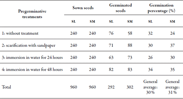 Likewise, various studies have recommended the use of mechanical scarification of seeds and their immersion in water as pregerminative treatments, considering different temperatures and periods (Belloso & Mazariego, 2013; Cordero et al., 2003; Pinilla et al, 2016; Torres-Torres, Medina et al., 2017).