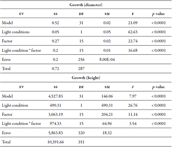 Results of growth in diameter and height of A. glabra seedlings suggest that there is a significant difference between the various factors considered and light conditions. Furthermore, the interactions between these also showed significant differences, since the p-values were lower than the confidence level (Tukey: p < 0.05) (tables 3 and 4).