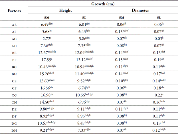 The lowest growth in height was found in the factors AE, AF, AG, AH, DE, DF, DG and DH (table 4), and were significantly different from the rest of the results obtained (Tukey: p > 0.05). These factors were composed of alluvial sand and alluvial sand + forest soil in a 2:1 ratio.