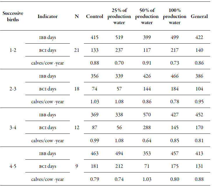 The behavior for the IBB and its derivatives BCI and birth rate in the successive birth sequences (1-2, 2-3, 3-4, 4-5, 5-6) analyzed by the Kruskal-Wallis test run for independent samples for each production water treatment, did not show changes that allow defining significant differences (p > 0.05) for percentages of production water by birth number, by rows and columns (table 5). The behavior of the IBB medians is irregularly shown between the birth sequences, a response that is possibly given by the fractionation of (n) by the birth sequence, contrary to the results of Arellano et al. (2006), which show a downward behavior over time. However, the control and 100 % production water treatments show the contiguous responses for most of the series evaluated (1-2 [415-499 days], 3-4 [369-427 days], 4-5 [463-457 days] and 5-6 [445-479 days]), and at a general level (414-422 days), answers that could be explaining the nonassociation of the behavior of this variable with the consumption of treated production water.