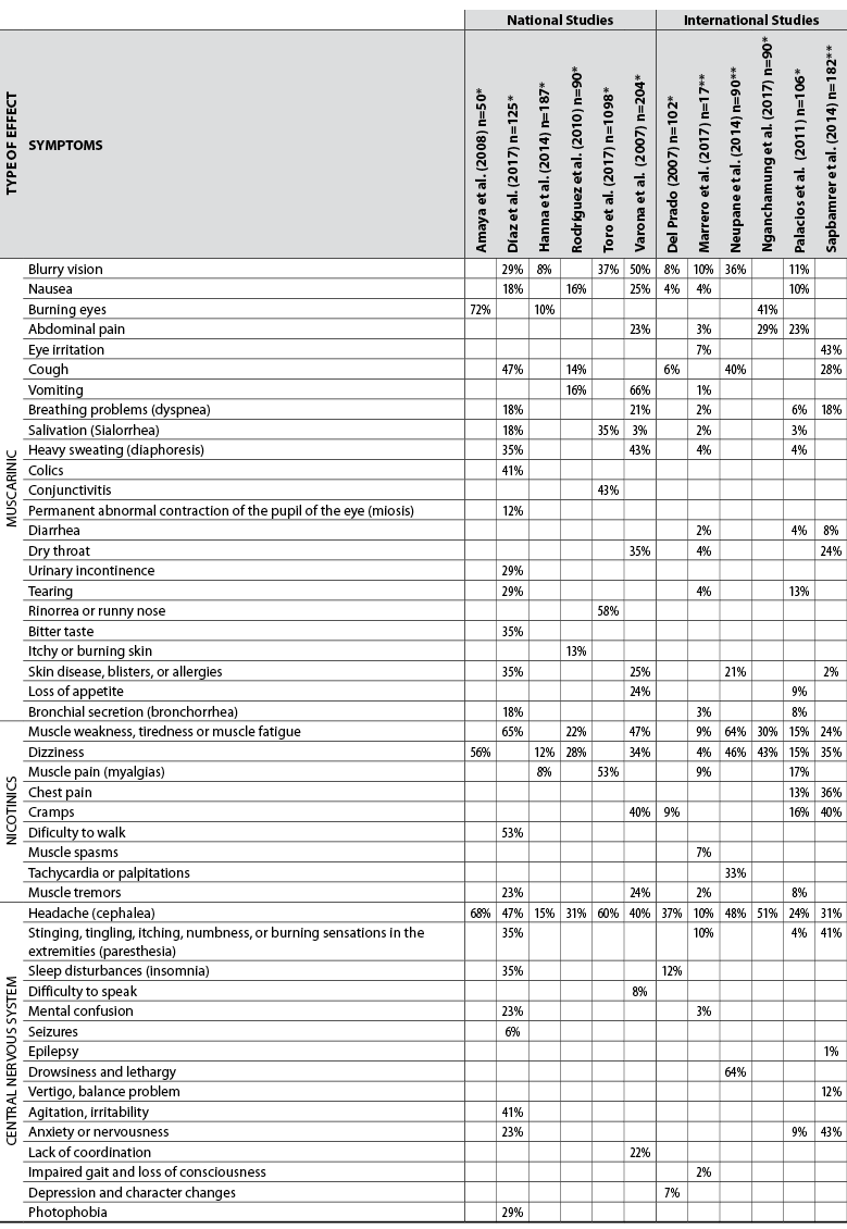The symptoms found in agricultural workers exposed to OP are documented in several national (Amaya et al., 2008; Díaz et al., 2017; Hanna & Orozco, 2014; Rodríguez et al., 2010; Toro et al., 2017; Varona et al., 2007) and international studies (Lu, 2007; Marrero et al., 2017; Neupane et al., 2014; Nganchamung et al., 2017; Palacios & Paz, 2011; Sapbamrer & Nata, 2014) that have measured the activity of cholinesterase enzymes, which are detailed in table 1.
