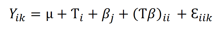 The experiment consisted of a two-way factorial design (three cultivars × five BAP levels) with 15 treatments and five replicates; 75 experimental units (vessels) were distributed with a completely randomized design. Every 20 days, cultures were added with 5 ml of a fresh liquid medium of the same formulation, according to the respective treatment, and stored as indicated in the establishment stage. After medium addition for the fourth time (120 days in culture), we registered the number of new shoots per explant and the average shoot length (in cm from the base to the leaf tip of ten shoots from each treatment). Data were analyzed using an ANOVA based on the model (1), where μ was the general mean, Ƭi was the effect of the cultivar, βj was the effect of the BAP level, and Ɛiik was the experimental error. Means were separated with Tukey’s test (α = 0.05).