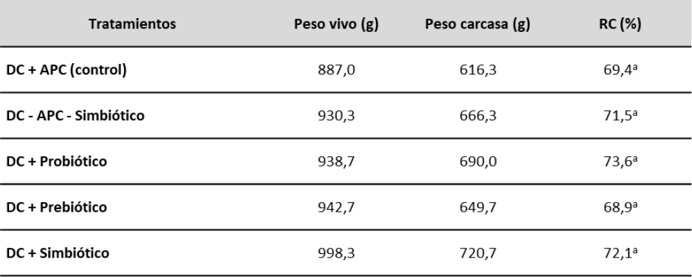Las tendencias a mayor rendimiento de carcasa, probablemente, se deben a que los probióticos como sustitutos de los APC, se asocian al aumento en la digestión y absorción de nutrientes (FAO, 2016); y los prebióticos tienen efectos benéficos en el huésped, estimulan el sistema inmune, la microbiota intestinal beneficiosa y la fisiología digestiva, entre otros (García et al., 2012), lo que mejoraría el rendimiento productivo general de los animales.