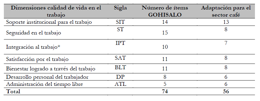 El instrumento que se utilizó para medir la calidad de vida en el trabajo fue el GOHISALO que evalúa 7 dimensiones (tabla 1) que fueron revisadas y adaptadas para la versión dirigida a la población caficultora. Es importante resaltar que el GOHISALO cuenta con un Alpha de Cronbach de 0,95.