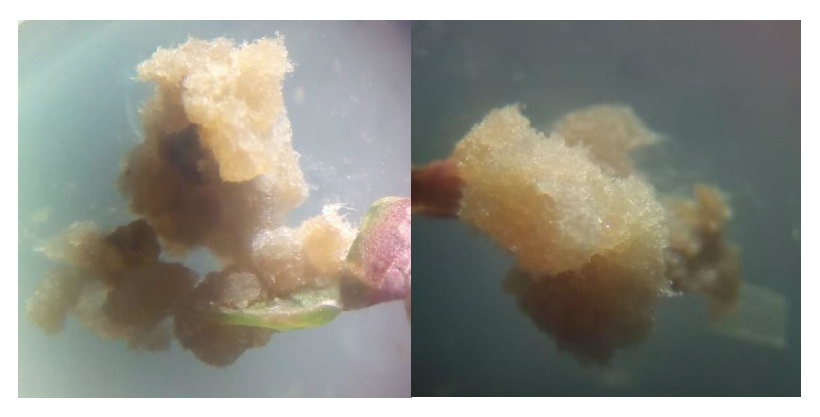 Se logró inducir a la formación de callos a partir de hojas de durazno, empleando 2,4-D y agua de coco en diferentes concentraciones en los medios de cultivos empleados, esto se debe a que los explantes en presencia de reguladores de crecimiento exógenos (o en algunos casos endógenos) presenta un cambio en su metabolismo celular, iniciando una división celular acelerada, dando lugar a la desdiferenciación celular, formando un tejido de células no especializadas llamado callo, el cual puede seguir creciendo, pero este proceso puede ser interrumpido para iniciar organogénesis o embriogénesis, potencialmente para la regeneración de la planta (George et al., 2008).