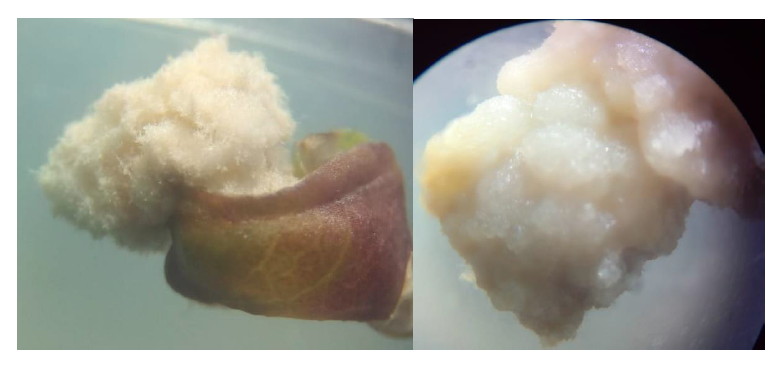Figura 1. Proliferación de callos friables a partir de hojas de durazno variedad Huayco rojo