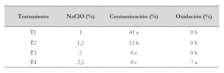 No se observaron explantes oxidados con el tratamiento T3 (NaClO 2 %). Este resultado favorable podría estar relacionado con las condiciones previstas para el explante, a parte de la concentración y tiempo de exposición en la solución de NaClO, se podría incluir la edad de los explantes, el medio de cultivo y la incubación en oscuridad. Tal como describe Azofeifa (2009), que dentro de las estrategias de reducir la oxidación de los explantes se debe considerar emplear hojas jóvenes, la concentración de las sales del medio de cultivo debe encontrarse a la mitad de su concentración y mantener los explantes en completa oscuridad.