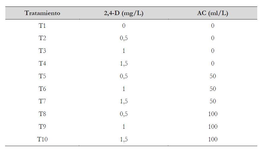 Para la inducción de callos se cultivaron, en placas de Petri, cinco explantes tratamiento (tabla 2) siendo estos la combinación de tres de ácido 2,4–diclorofenoxiacético y tres concentraciones de agua de coco (tabla 2); se consideró un testigo absoluto sin 2,4-D ni agua de coco. Todos los tratamientos se mantuvieron en cámara de incubación a 25 °C en completa oscuridad, durante 35 días.