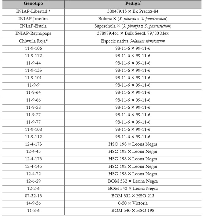 Tabla 1 Genotipos de papa utilizados para la evaluación de los componentes de la resistencia al tizón tardío Phytophthora infestans Pichincha Ecuador