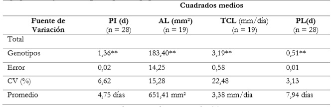 Nota:PI = periodo de incubación; AL = área de lesión; TCL = tasa de crecimiento de la lesión; PL = periodo de latencia; **significativo al 1%; CV = coeficiente de variación; n = genotipos evaluados.