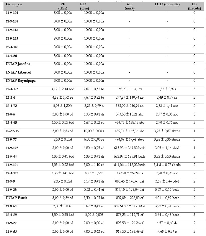 Los genotipos presentaron diferencias estadísticas para el área de la lesión a los ocho días después de la inoculación (tabla 2). Los genotipos 12-4-173, 12-2-6 y 12-4-72 presentaron un área de la lesión con valores menores a 369,00 mm2, mientras que la variedad nativa Chiwuila roja presentó la mayor área de lesión con 1.111,50 mm2 (tabla 3). Rivadeneira et al. (2020), al evaluar AL de P. infestans en variedades mejoradas, encontraron valores menores a 54,46 mm2. Por su parte, Andrivon et al. (2003), al evaluar el AL en progenies de S. bertahultii, S. phureja, S. tuberosum y S. vernei, también presentaron valores entre 45 a 122 mm2. Posiblemente, los altos promedios de AL en este estudio se deben a la inoculación de la raza compleja con once factores de virulencia de P. infestansy a la variabilidad en la susceptibilidad de los materiales estudiados.