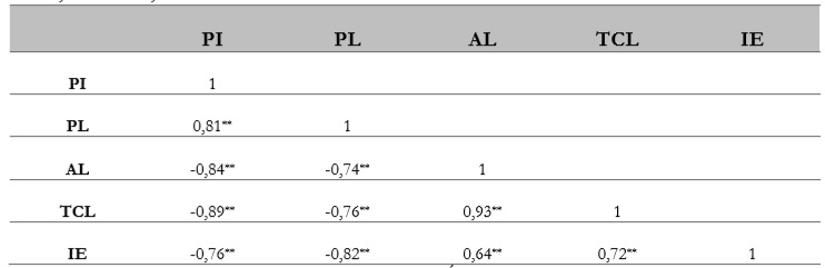 Al realizar la correlación de Pearson, entre los componentes de resistencia a P. infestans, de los diferentes materiales de papa, se pudo determinar que estos mostraron una relación significativa al 1% en todos los casos. Sin embargo, la correlación entre PI con AL, TCL, y IE fue inversamente proporcional, ya que presentó valores negativos; es decir, a mayor PI, se espera un menor PL, AL, TCL y IE. Este mismo comportamiento se pudo observar cuando se realizó la correlación entre el PL con los componentes AL, TCL y EI (tabla 4). Por su parte, la correlación de Pearson entre PI con PL, AL con TCL e IE y LCT con IE fueron positivas y significativas al 1%, por lo que son directamente proporcionales (tabla 4). Por eso, este componente podría utilizarse como un indicador del nivel de resistencia a P. infestans.