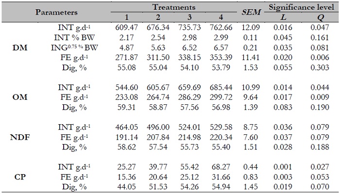 Table 3. Intake (INT), fecal excretion (FE), and digestibility (Dig) of dry matter (DM), organic matter (OM), neutral detergent fiber (NDF), and crude protein (CP) in lambs fed with G. ulmifolia leaves