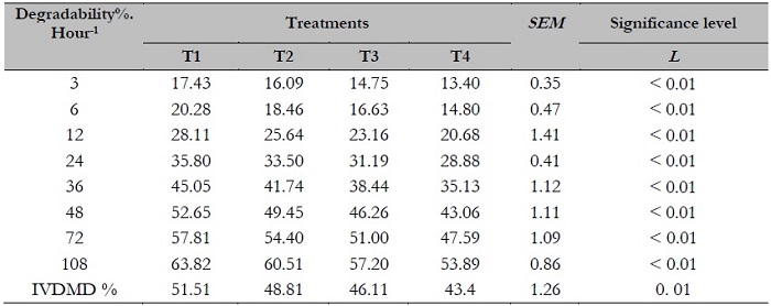The in vitro dry matter degradability decreased linearly in each incubation period. This trend remained for all incubation schedules. From 36 hours of incubation, the control treatment had a degradability of 10% above T4 (45% G. ulmifolia). Additionally, we observed a linear decrease (P < 0.05) of the IVDMD, while the levels of G. ulmifolia leaves in the diets increased, obtaining values of 51.51% (T1), 48.8% (T2), 46.1% (T3), and 43.4% (T4), respectively (Table 4).