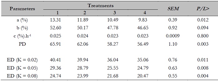 Table 5. In vitro ruminal degradation parameters in diets with different levels of G. ulmifolia leaves