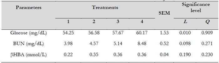 The glucose, blood urea nitrogen (BUN), and beta-hydroxybutyric acid (βHBA) were determined for each animal on the last day of the experimental period utilizing a venipuncture of the jugular vein with Vacutainer™ tubes. The samples were refrigerated and analyzed using commercial Biosystems® kits (glucose and BUN and Randox® (βHBA) with the automated system of blood chemistry Biosystems A15® at the Veterinary Diagnostic Laboratory (LADIVE, for its acronym in Spanish) of the Universidad del Tolima.