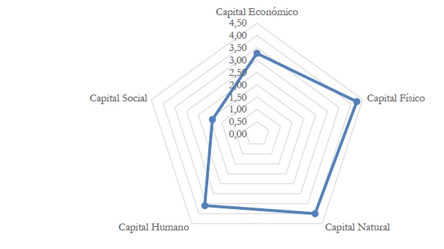 En cuanto a los medios de vida sostenibles, se realiza un análisis a partir de los capitales, con la finalidad de identificar los pilares de desarrollo y las vulnerabilidades. A partir de los resultados obtenidos de los indicadores (tabla 4 y figura 3), se identifica que el capital físico presenta indicadores más cercanos a 5, lo que se considera óptimo. Por el contrario, el capital social representa una vulnerabilidad debido a que no existe un sentido marcado de comunidad en las zonas urbanas. Adicionalmente, factores importantes para tener en cuenta son: dificultad de acceso a servicios básicos, alcoholismo, delincuencia común, emergencia sanitaria, fragmentación de tierras, acceso a la educación y la principal: el factor económico acompañado de la pobreza y el desempleo.