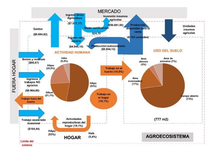 Se consideró la integración de dos metodologías por la necesidad de obtener indicadores que permitan conocer en los agroecosistemas algunos elementos que se deben cambiar para lograr un mayor acercamiento a la sostenibilidad. Por un lado, se encuentra MuSIASEM, que identifica la interfaz entre los factores económico, demográfico, social y los procesos biofísicos con el ecosistema. Por otro lado, los medios de vida sostenibles que relacionan un conjunto de insumos (capitales o recursos) con las salidas (estrategias de vida) hacia la consecución de resultados enfocados en el bienestar humano y la sostenibilidad ambiental. Empero, MuSIASEM presenta una oportunidad al permitir identificar la inconmensurabilidad a partir de procedimientos contables adaptados a cada realidad. De igual forma, los medios de vida sostenibles permiten comprender la forma en que las personas enfrentan la pobreza en un sentido material en conjunto con sus percepciones de bienestar en función de elecciones y estrategias de subsistencia. Es así como el análisis conjunto permite comprender la compleja combinación de actividades generadoras de ingresos con las actividades que permiten la reproducción de la unidad doméstica de cada productor orgánico certificado